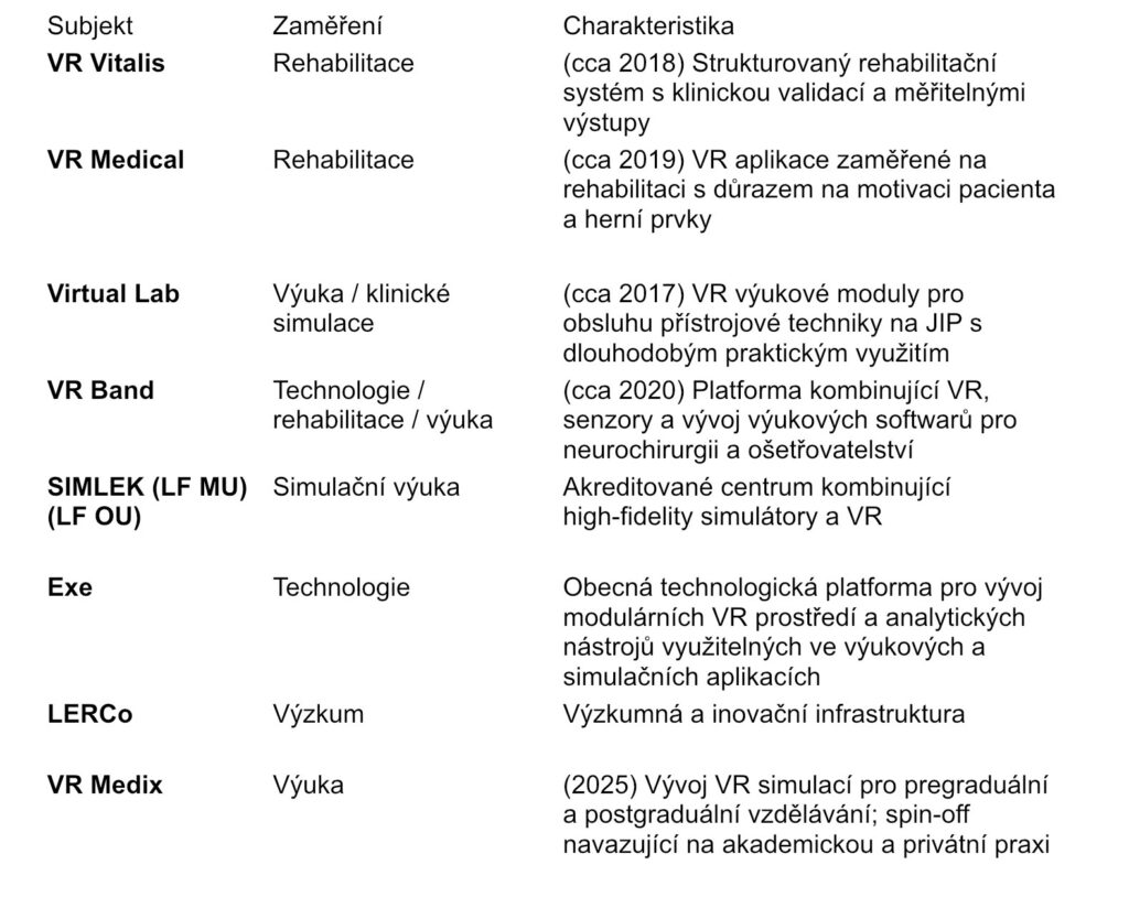 Český VR/AR ekosystém zahrnuje strukturované rehabilitační systémy s měřitelnými klinickými výstupy, imerzivní simulační platformy pro pregraduální a postgraduální vzdělávání a technologické platformy umožňující jejich vývoj a škálování.